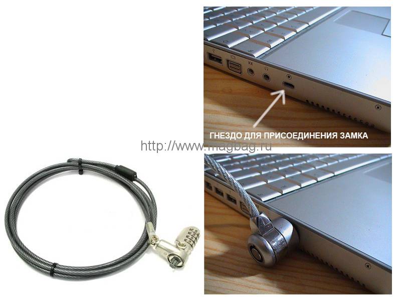 Одним концом замок фиксируется к какому-либо предмету, например, письменному столу или чемодану, а другим, имеющим металлический фиксатор к устройству в специальное гнездо (смотрите большой рисунок).